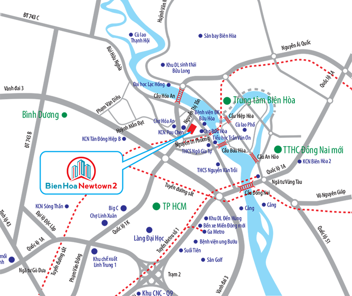 Dự Án Biên Hòa Newtown 2 Tọa lạc ngay mặt tiền đường Nguyễn Thị Tồn, nơi giao thoa của tam giác kinh tế trọng điểm phía Nam gồm TPHCM, Đồng Nai và Bình Dương, Bien Hoa New Town 2 có vị trí thuận lợi kết nối với nhiều tuyến đường như Bùi Hữu Nghĩa, Quốc lộ 1K, Quốc lộ 1A, đường Vành đai 3, cầu An Hảo,… Đây là những tuyến đường huyết mạch giúp cho việc di chuyển của cư dân dễ dàng, nhanh chóng đến TPHCM và các tỉnh, thành lân cận như Bình Dương, Bà Rịa - Vũng Tàu,…