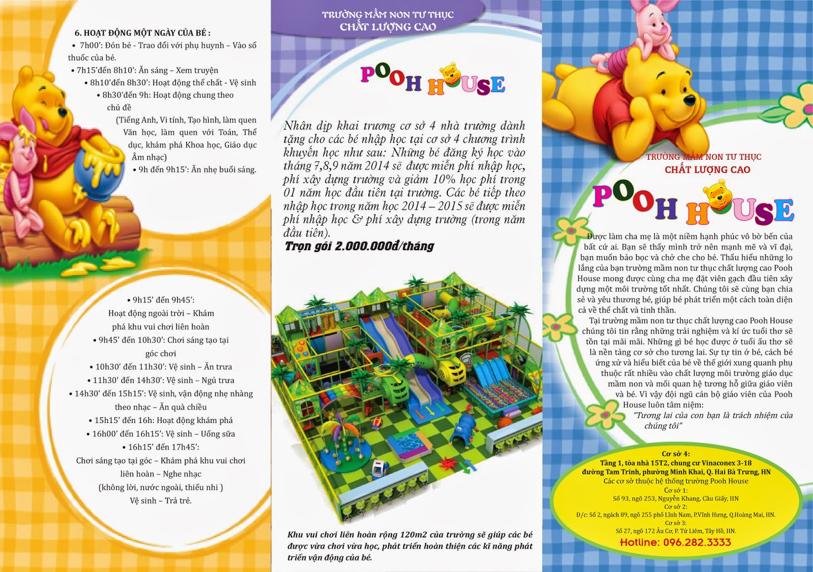 Mầm non tư thục "Nhà Gấu Pooh" Địa chỉ : Tầng 1, tòa nhà 15T2, chung cư Vinaconex 3-18 đường Tam Trinh, phường Minh Khai, Q. Hai Bà Trưng, HN Hotline: 096.282.3333 Thông tin tuyển sinh ![]() Học phí 2.000.000đ/1tháng cho bé ![]() Xem thêm : Khu vui chơi liên hoàn của trường mầm non Pooh House FACEBOOK POOH HOUSE